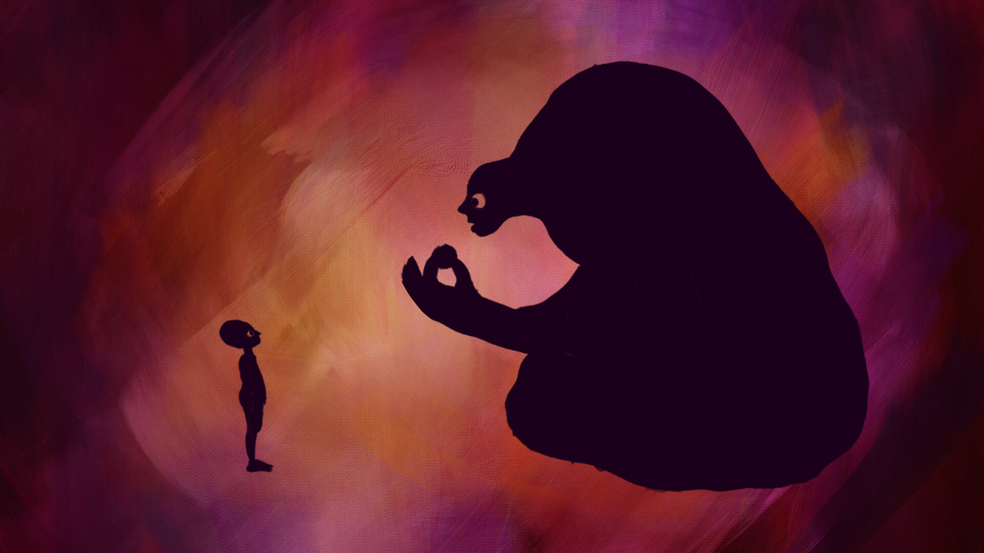 Symbolisch für diese Erkenntnis geben die Kinder dem Kind etwas von der Substanz der leuchtenden Kugel ab, welches diese staunend in der Hand hält.