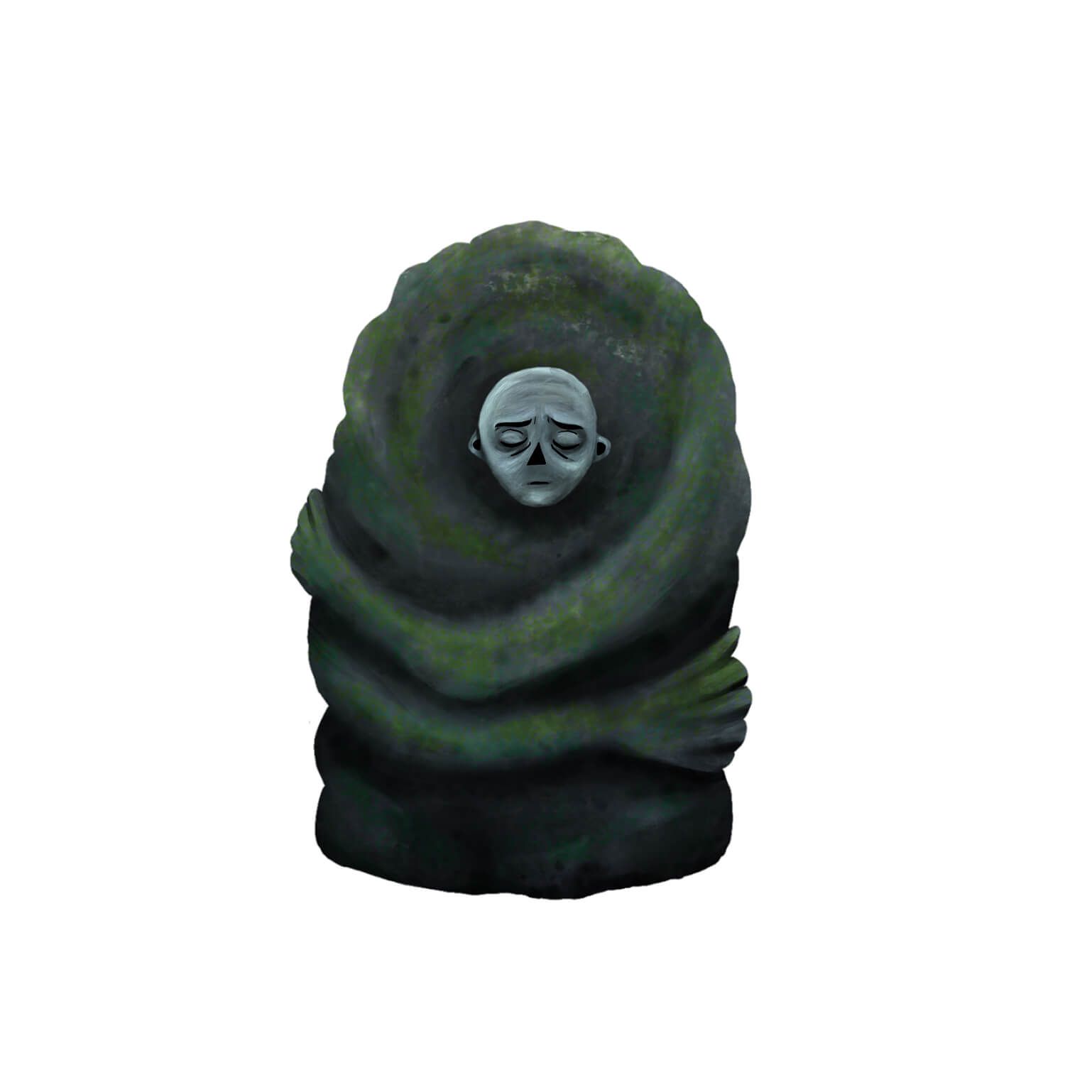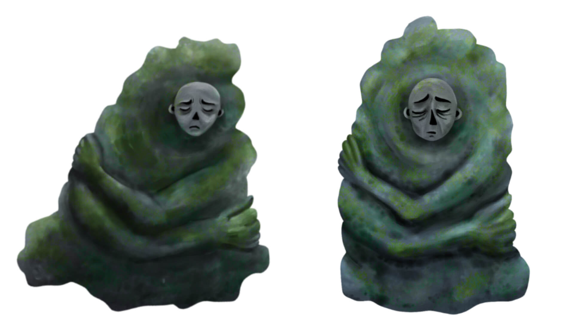 Um sie herum stehen viele weitere kleinere Steine, Ă€hnlich dem, aus dem das Kind geschlĂŒpft ist. Einige der GrĂŒnen Felsen haben Höhlen, die den Löchern des Kindes Àhneln.